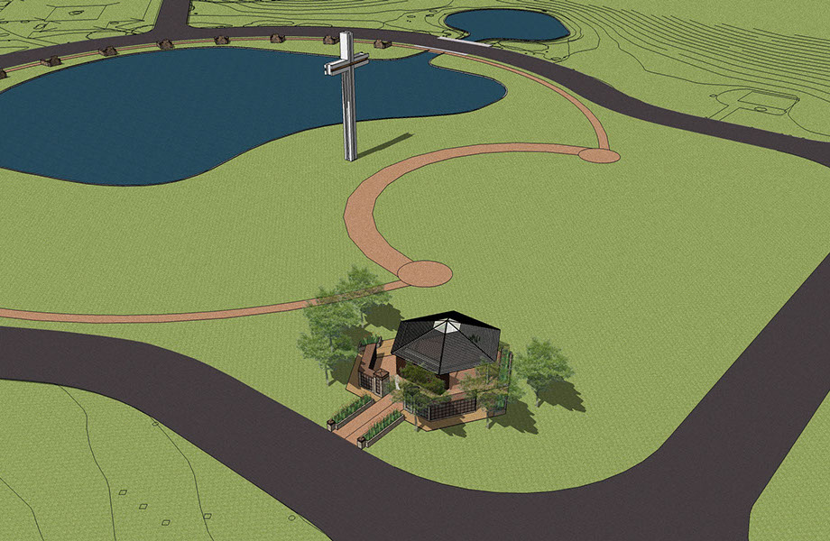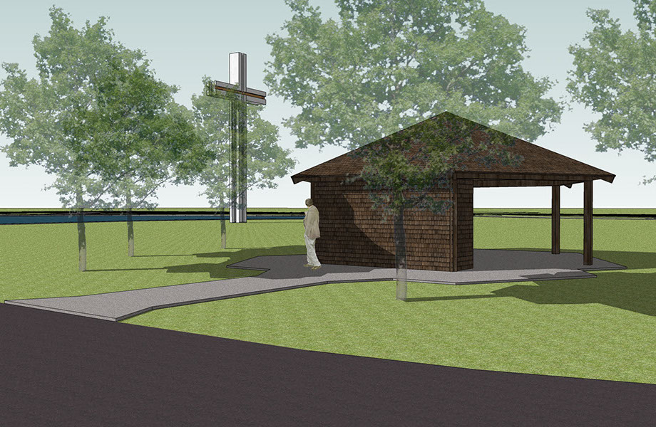 The street side of the pavilion was ringed with niches while the lake side of the building was left open to maximize the views out towards the lake and the future cross.