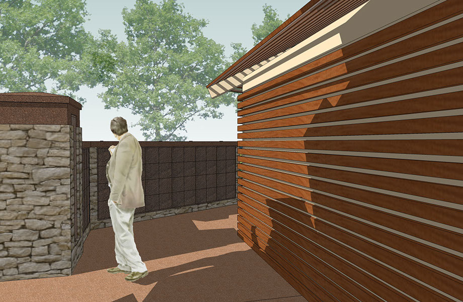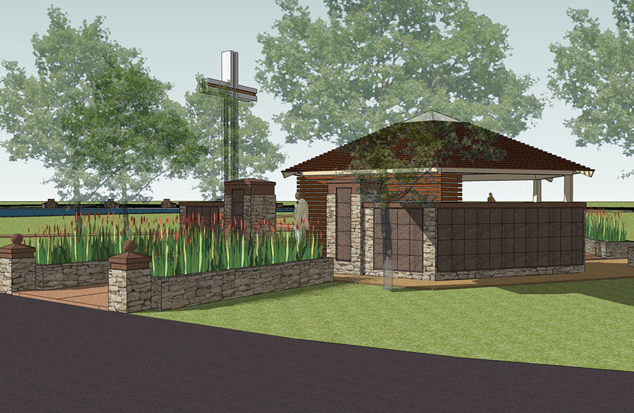 The existing gazebo featured a heavy roof structure, which made the interior dark, and a solid wall blocked the approach from the street. To ameliorate these issues, we proposed to remove the roof structure and replace it with an arbor structure covered by a translucent panel product. This allowed for ample natural light, and created a shadow pattern that would add beauty and interest to this sacred space. The existing solid wall was re-purposed to house niches as well as a dedication that would greet visitors upon entry into the space.