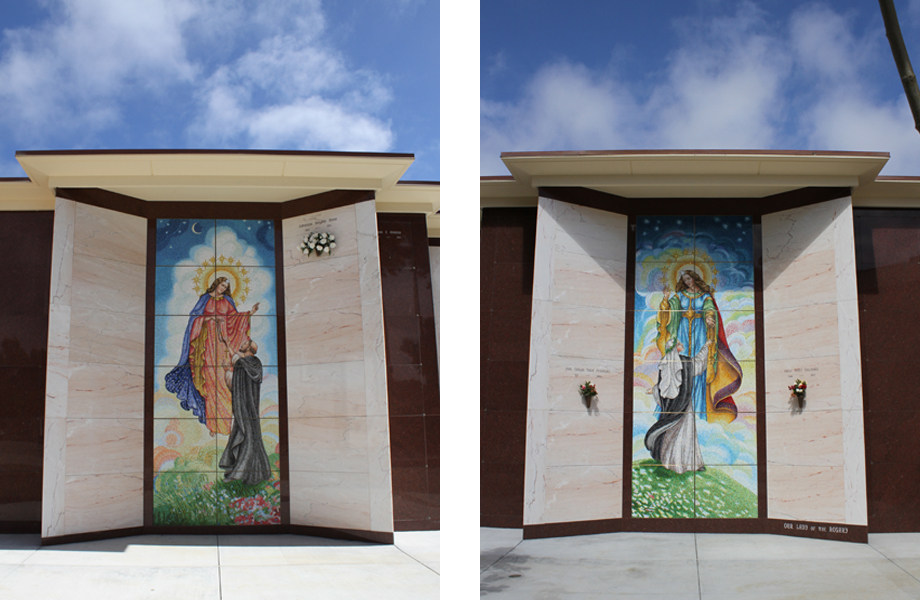 Our Lady of the Rosary, Our Lady of Faith, and Our Lady of Charity are the final three garden crypt buildings in the Our lady’s Lane development. The three buildings are shaded by a row of trees along the street and a landscaped hill behind. Our Lady of the Rosary features two large-scale sets of artist-commissioned tile mosaic shutters on its north and south facades.