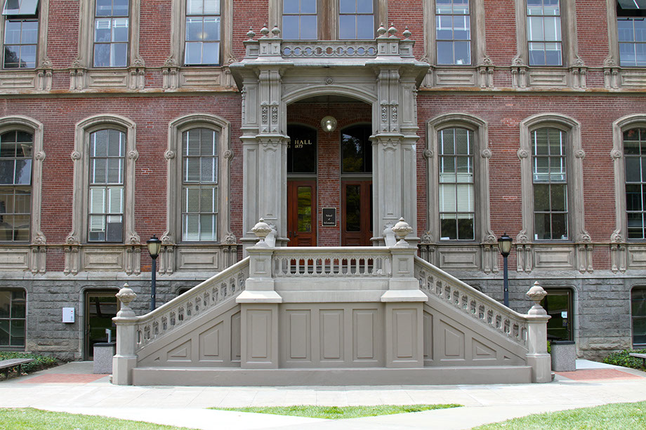 The original construction of the wooden porch and entry to the oldest building on campus had deteriorated beyond repair, and suffered from a 1970’s gold anodized aluminum storefront enclosure.