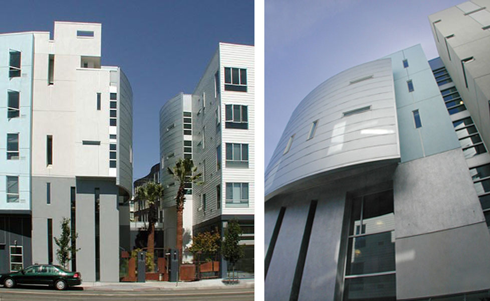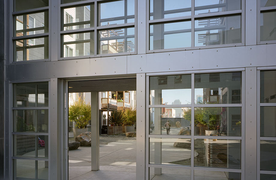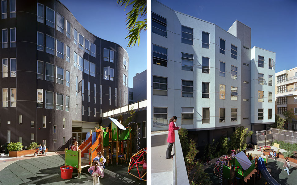 This five-story affordable complex combines apartments and modern single-occupancy studios with a wealth of community spaces, including an on-site daycare, a full service, organic grocery store and commercial spaces.