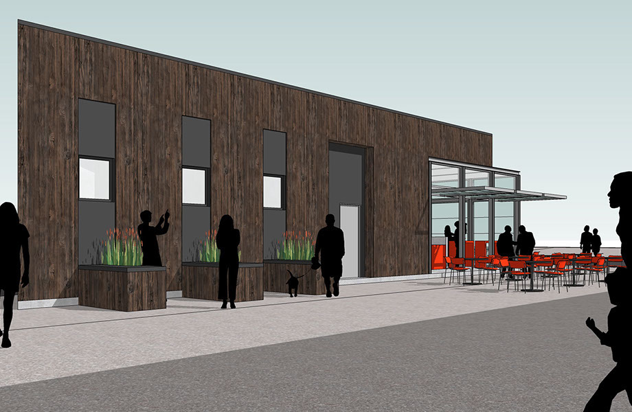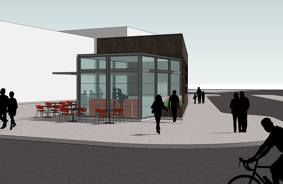 Bishop's Burger Spot was conceived as a sort of jewel box. At only 750 sf, the details are key. Located in the Bayview at a strategic corner of Mendell Plaza, the new building will anchor and activate the plaza, giving it program and function. The building was designed to function as a social node and an extension of the plaza, with its main entrance and active facade facing, and opening up to, the plaza.