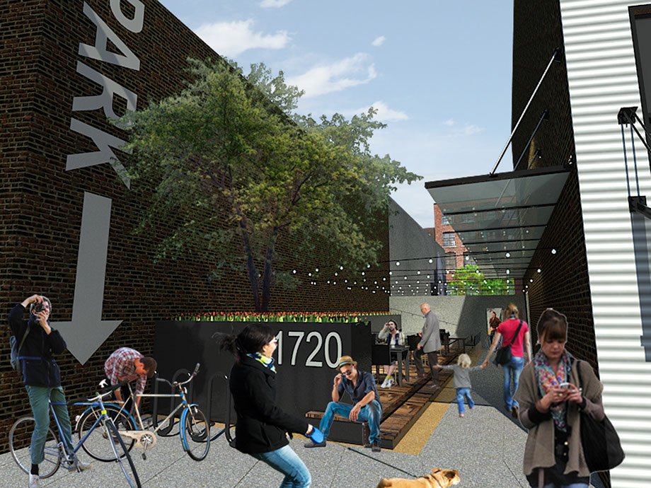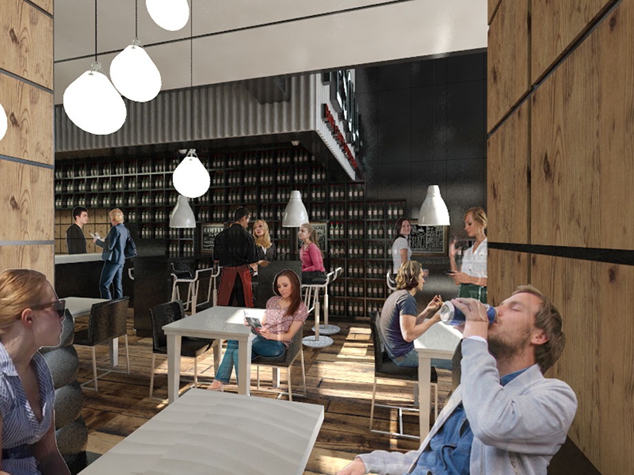 Environmental goals were key in the design of the interior spaces and the façade. Interior finishes will make use of recycled materials. The café tables are fabricated from reclaimed bicycle wheels infilled with a solid surface of recycled glass. The same recycled glass tiles were then used to cover the face of the building. Large storefront windows allow for natural ventilation & daylight.