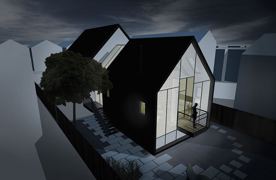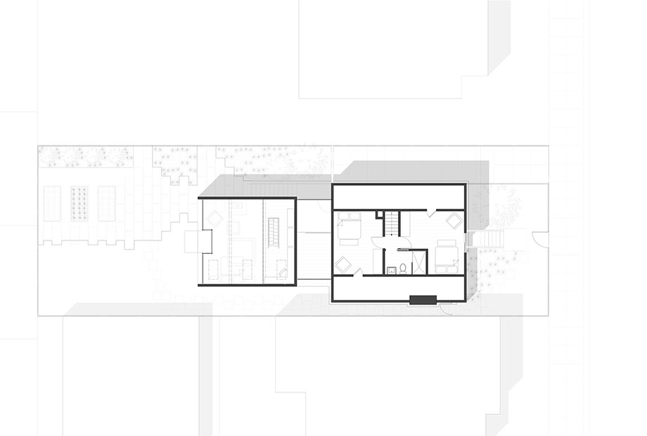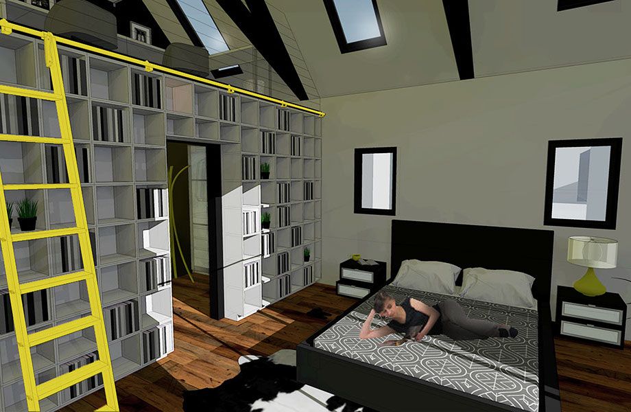 Because of the small floor plate, the client's desire for a large, voluminous master suite was accommodated through a rear addition, which would include the master bedroom, bathroom, dressing area, a family lofted reading nook, and an office nook as part of the master bedroom. By maintaining the existing A-frame shape of the home, we were able to create large lofty spaces and keep the addition invisible from the street so as not to contrast with the existing historic facade along the street.